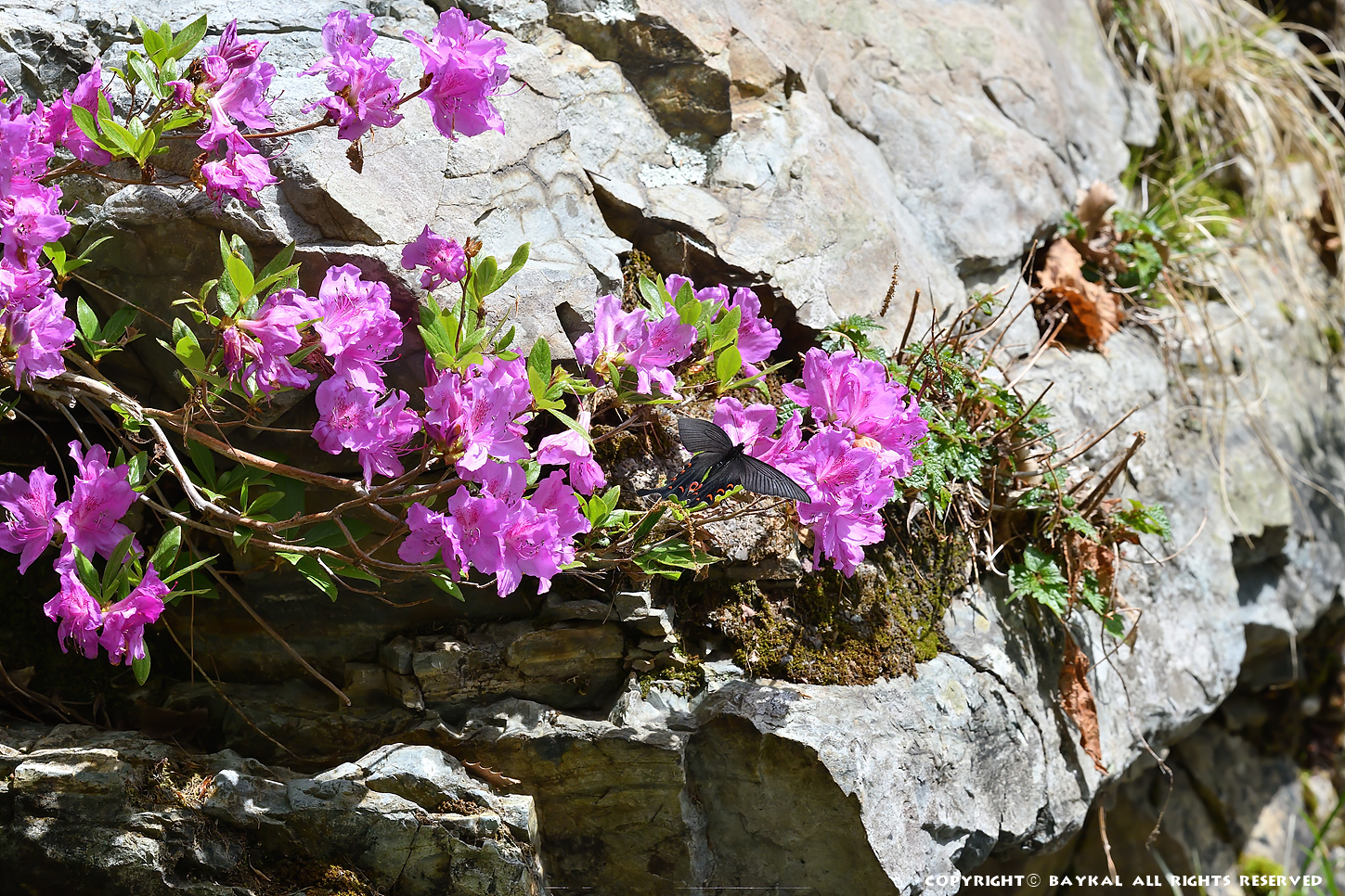 계곡가 산철쭉 꽃에 긴꼬리제비나비가 날아든다
