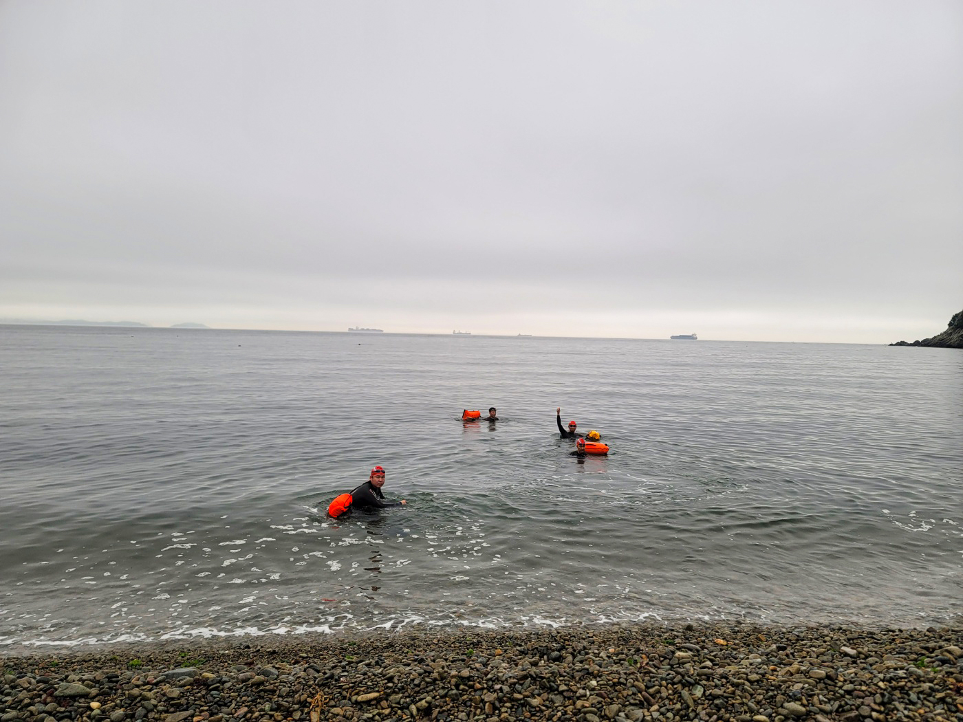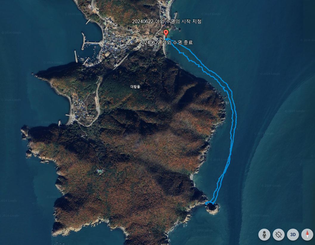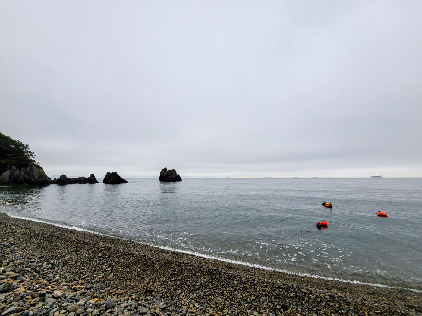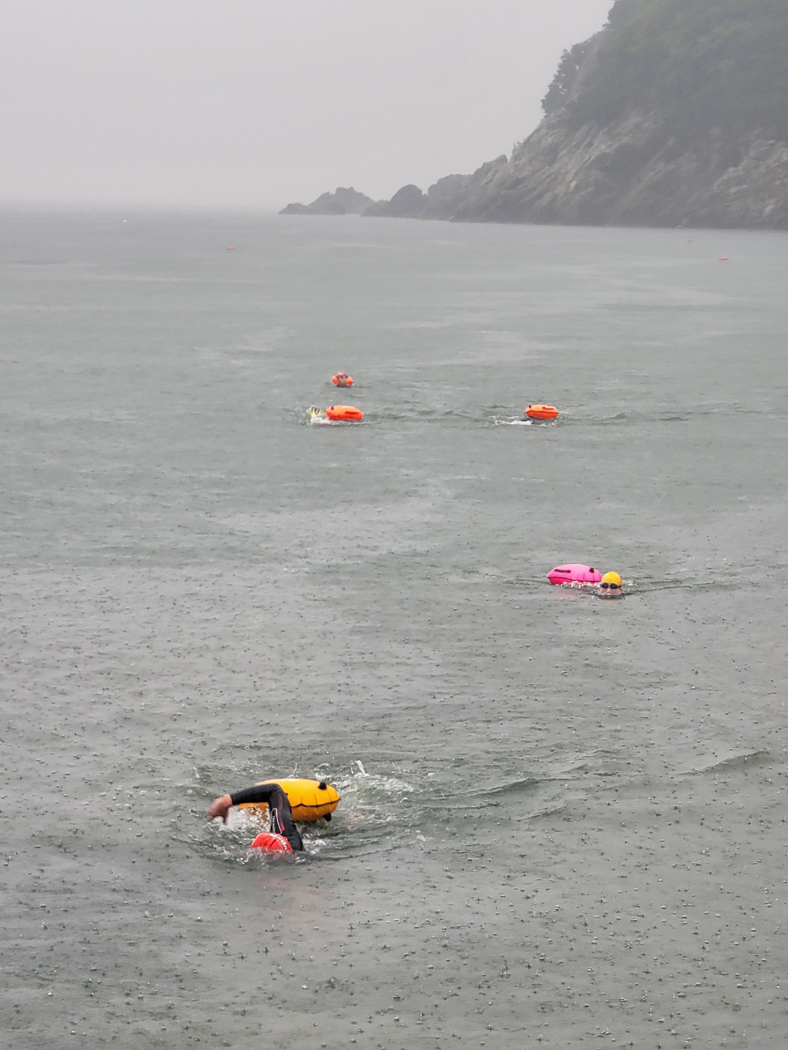 구디너프 앞 해변에서 사무영섬 을 거쳐 아동섬 까지 왕복 5.3km에 이르는 바다 수영길 잔잔한 파도를 따라 펼쳐지는 풍경은 환상적이었고 바다에 쏟아지는 비를 맞으며 낭만을 즐겼다 ^^b